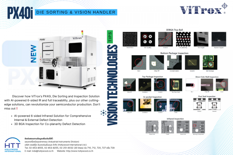 ViTrox PX40i is an automated Die Sorting & Inspection Solution designed to meet the demands of modern semiconductor production. Powered by AI and Intelligent Vision Systems, PX40i offers high-speed and high-precision defect detection (both surface-level and internal), ensuring optimal product quality. With full traceability and advanced multi-angle inspection, this solution is ideal for manufacturers seeking to enhance quality control and minimize yield loss.