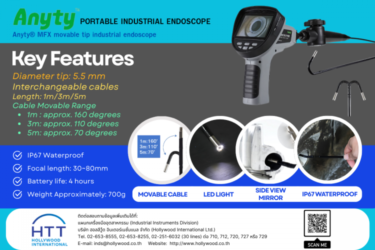 Anyty® MFX Series is an industrial endoscope with a tip-moving camera diameter of 5.5 mm. With a tip that can be tilted up to 160 degrees on one side, it enables smooth inspection of curved pipes. Even in places where the tip cannot be bent, an included length of Interchangeable cables 1.0-3.0 meters is available. Comes with a built-in LED light system. It can be chosen according to the suitability of the work in industries such as the aviation industry, the automotive industry, the manufacturing industry, and other various leading industries that require inspection or maintenance for maximum efficiency.