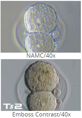 Emboss Contrast is a cost-effective optical technique which does not require costly optics, which provides pseudo-three dimensional and glare-free images for thick specimens such as iPS cells which would normally suffer from halos with conventional phase contrast methods.