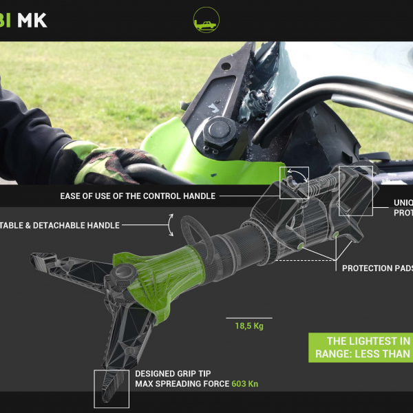 Combi tool model "MK" from France weighs only 19 kg. The spreading force is 48–783 kN and is able to cut up to 30 mm. steel bar diameter. The handle around the spreading head can rotate 360° for convenient operation and will be most used for big rescue operations in buildings and secluded areas after road traffic accidents.
