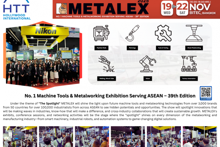 Hollywood International Company Limited cordially invites you to attend METALEX 2025, the largest international exhibition of machinery and technology in ASEAN. Returning with grandeur and readiness to present the most advanced, state-of-the-art technology in the industrial sector under the concept "The Spotlight", METALEX will showcase future machine tools and metalworking technology from over 3,000 brands from 50 countries to more than 100,000 industrial entrepreneurs across ASEAN. We are ready to move forward together in the era of innovation.