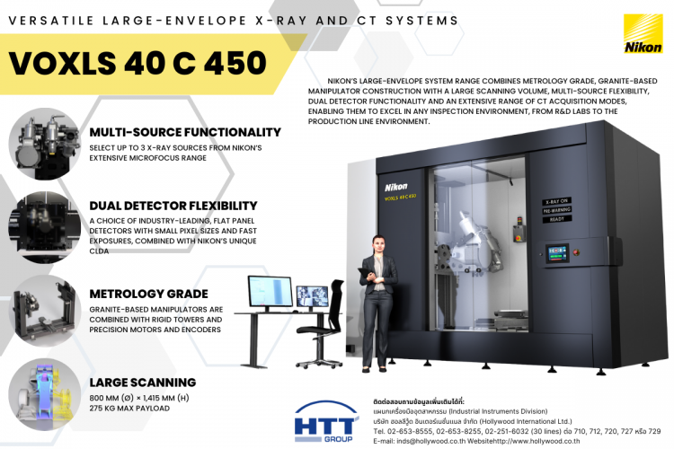 The VOXLS 40 C 450 is outfitted with two Nikon High-Power Microfocus X-ray Sources (225 kV and 450 kV), providing exceptional flexibility for scanning a wide range of component sizes and material densities. Both sources are equipped with Nikon’s unique rotating target technology, providing ultra-high resolution at industry-leading power to enable even the smallest defects inside an object to be identified quickly and easily. We boast the largest scanning envelope of any single-piece cabinet system on the market today. Objects up to 800 mm in diameter, 1415 mm in height, and 275 kg in weight can be inspected in exceptional detail.