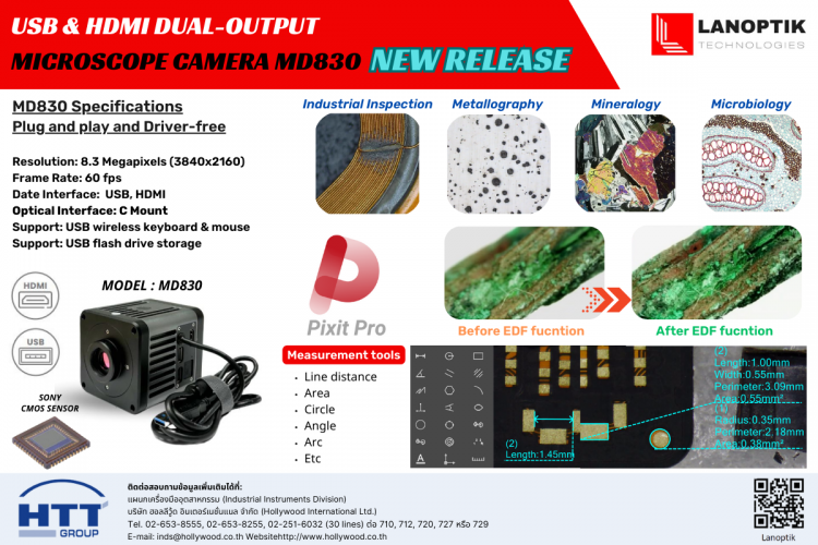 Lanoptik Microscope Camera MD830 is a digital imaging device that has the USB and HDMI signal output in a single unit. It is equipped with a high-quality Sony CMOS sensor. The MD830 digital camera connects to microscopes via a C-Mount interface. It is designed for image inspection work in various industries such as electronics, medical, and automotive industries.