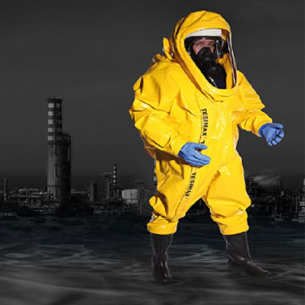 - The suit is one-piece suit encapsulating design with protection against solid, liquid, vaporized and gaseous chemicals as well as heat