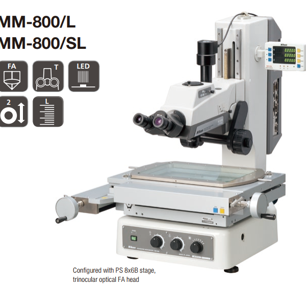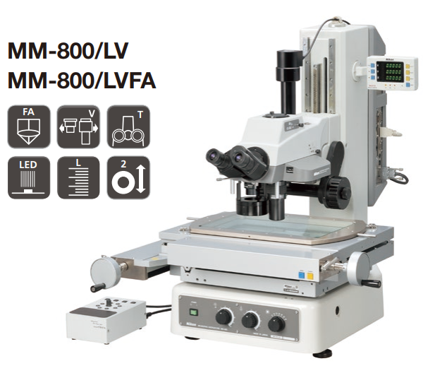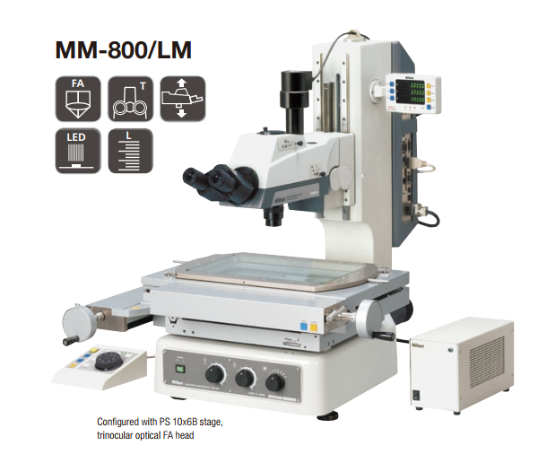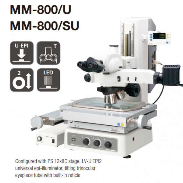 The MM800 is a new series of innovative measuring microscopes designed for industrial measurement and image analysis. They integrate key performance features delivering complete digital control for maximum measuring accuracy in demanding industrial environments. The systems support a host of new and expanded features including Nikon's electronic connection hub connection that provides total integration of microscope peripherals managed by Nikon's EMAX2 metrology software.