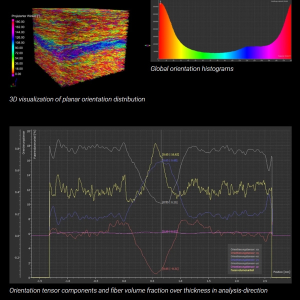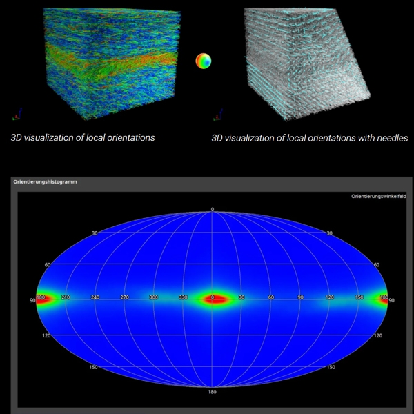 - Visualize local orientations either with a color overlay or with three-dimensional needles to gain a qualitative understanding of the fiber orientation inside your sample or component.