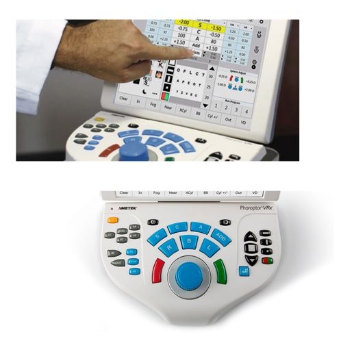 The Phoroptor VRx controller features a logically and ergonomically arranged keypad, designed to enhance the user experience. Buttons are grouped based on functionality for easy access: gray for data, blue for refraction, and black for acuity. Buttons are also LED backlit for better visibility in dimly lit exam rooms.