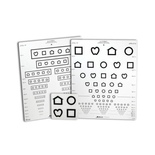 A pediatric distance visual acuity eye chart featuring LEA SYMBOLS® for screening or testing individuals beginning at age 21/2. The front side of the eye chart features pediatric symbols in proportionally spaced lines (ETDRS format) for monocular (testing one eye with the other eye occluded) and binocular (testing both eyes simultaneously) visual acuity testing or screening. The opposite side features pediatric symbols in the Massachusetts Visual Acuity Format for both left and right eye testing.