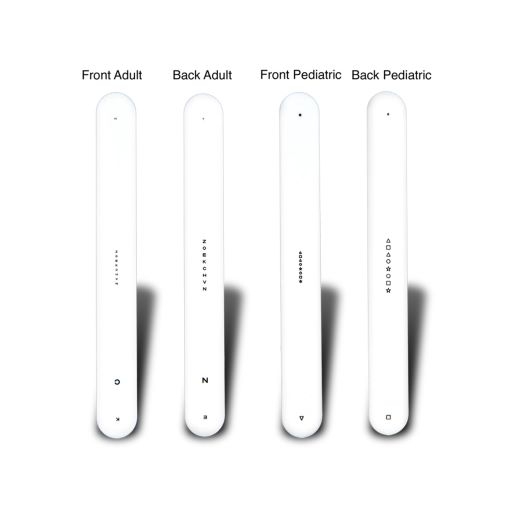 This set of four Fixation Sticks (two adult, two pediatric) has detailed targets to stimulate accommodation and assesses Fixation and saccades. Set includes four targets printed on both sides with pediatric symbols for young children and two targets printed on both sides with Sloan Letter for young and older adults. Each pair contain the same layout on each stick.