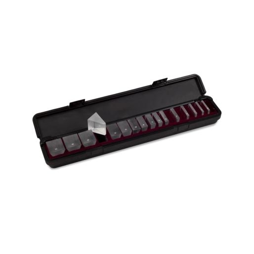 16 Piece Prism Set includes: ½, 1, 2, 4, 6, 8, 10, 12, 15, 20, 25, 30, 35, 40, 45, and 50 diopter plus red lens. Each measures 37 mm square.