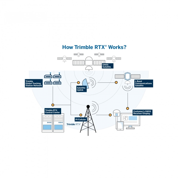 The Trimble RTX™ correction service is a high‑accuracy, precise point positioning (PPP) system that provides real‑time centimeter positioning without the need for an RTK base station or VRS network.