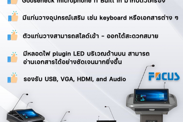 Digital podium ที่มาพร้อมไมค์ประชุมและตัวเครื่อง All in one ขนาด 21.5 นิ้ว ที่ Built in มาในตัว Digital Podium เพื่อให้ผู้นำประชุมสามารถนำเสนองานผ่าน Digital podium ได้อย่างสะดวก มากกว่านั้นจุดเด่นของ Digital Podium รุ่น FK500Y ยังมาพร้อมกับแท่นวางอุปกรณ์เสริมเช่น keyboard หรือ เอกสารต่าง ๆ ตัวแท่นวางสามารถสไลด์เข้า - ออกได้สะดวกสบาย และยังมีหลอดไฟ plugin LED เพื่อให้ผู้นำประชุมสามารถอ่านเอกสารได้อย่างชัดเจนมากยิ่งขึ้น