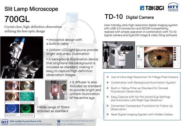 แผนกเครื่องมือแพทย์ (Medical Instruments Division) บริษัท ฮอลลีวู้ด อินเตอร์เนชั่นแนล จำกัด ตัวแทนจำหน่ายกล้องจุลทรรศน์ตรวจตาชนิดลำแสงแคบ (Slit Lamp) ยี่ห้อ Takagi รุ่น 700GL จากประเทศญี่ปุ่น พร้อมชุดถ่ายภาพดิจิตอล (TD-10 Digital Camera) โดย Slit lamp รุ่นนี้มีแหล่งกำเนิดแสงชนิด LED ทำให้ได้ภาพที่สว่าง คมชัด ประกอบกับตัวกล้อง Built-in ฟิลเตอร์ที่หลากหลาย ทำให้เหมาะกับงานตรวจตาหลายรูปแบบ ยิ่งไปกว่านั้น ชุดแสดงภาพผ่านทางหน้าจอนั้นมีความละเอียดของภาพสูงถึง 10 ล้านพิกเซล ทำให้ได้ภาพหน้าจอที่มีความคมชัดสูง เพื่อให้แพทย์สามารถใช้ภาพประกอบการอธิบายโรคและแนะนำคนไข้สำหรับการรักษาต่อไป อีกทั้งยังสามารถจัดเก็บภาพถ่ายไว้เพื่อดูภาพย้อนหลังและเปรียบเทียบผลการรักษาในแต่ละครั้งได้อีกด้วย