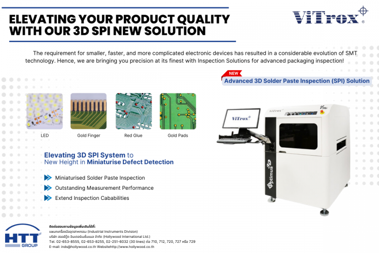 SMT PCBA ที่ปฏิวัติวงการของ ViTrox! ได้เปิดตัวโซลูชันล้ำสมัยสองรายการ - SPI & AOI ที่ช่วยเพิ่มประสิทธิภาพการตรวจสอบชิ้นส่วน ในอุตสาหกรรมการผลิตเซมิคอนดักเตอร์แบ็กเอนด์ และ SMT PCBA โดยโซลูชัน 3D SPI (New) ดฃโดยระบบประกอบด้วยโมดูลกล้องความละเอียดสูง ที่สามารถตรวจจับข้อบกพร่องผ่านกล้องจุลทรรศน์ที่เล็กที่สุด ด้วยความละเอียดของกล้อง 25MP ที่ 4.5um/px และ ฟังก์ชั่น Motorised Z-Height ช่วยเพิ่มผลผลิต และลดงานคัดออกของงาน โดยการระบุข้อบกพร่องตั้งแต่เนิ่นๆ เพื่อให้บรรลุเป้าหมายด้านความคุ้มค่า
