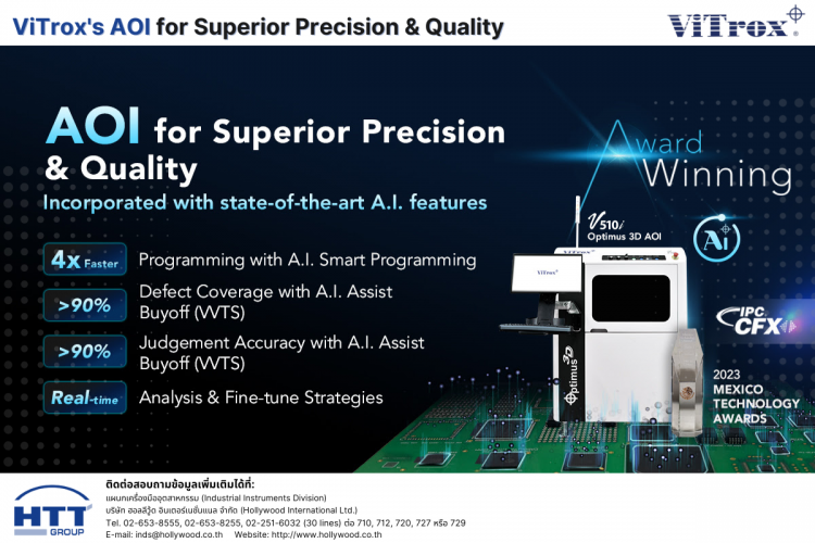 นอกจากนี้ V510i 3D AOI ยังมีระบบ A.I. ViTrox Verification Tool Solution (A.I. VVTS) ซึ่งเป็น A.I. สำหรับช่วยในการวิเคราะห์และตัดสินใจหลังการตรวจสอบให้ดียิ่งขึ้น ช่วยขจัดข้อผิดพลาดจากการตัดสินโดยคน ระบบอัตโนมัตินี้เพิ่มความคล่องตัวให้กับกระบวนการ Buy-off ใน Repair Station และให้ผลการตรวจสอบที่แน่นอนสม่ำเสมอด้วยระดับความแม่นยำจาก A.I. ที่น่าประทับใจถึง 90 % ส่งผลให้อัตราการหลุดรอดของชิ้นงานที่มีปัญหาน้อยกว่า 1% ทำให้ลูกค้ามีความมั่นใจในผลการตรวจสอบในระดับสูงสุด นอกจากนี้ A.I. VVTS ยังสามารถครอบคลุมการตรวจสอบได้มากกว่า 90% สำหรับข้อบกพร่องทั่วไปและข้อบกพร่องที่ท้าทาย ทำให้ผู้ใช้งานสามาถทำการ Buy-off การผลิตได้แบบอัตโนมัติ ช่วยปรับปรุงผลผลิตได้สูงสุดถึง 50% และลดต้นทุนค่าแรงได้สูงสุดถึง 60%