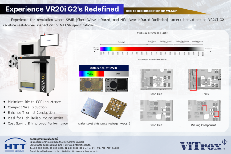 ในขณะที่ระบบ Vision ทั่วไปเห็นได้เพียงผิวนอกของชิ้นงาน ViTrox VR20i G2 มาพร้อมระบบกล้อง SWIR (Short-Wave Infrared) และ NIR (Near-Infrared) ที่สามารถมองทะลุชั้นซิลิคอนได้อย่างชัดเจน สามารถตรวจจับข้อบกพร่องภายในที่มองไม่เห็นด้วยตาเปล่า เช่น รอยร้าว การแยกชั้น หรือการเชื่อมต่อที่ไม่สมบูรณ์ เพิ่มความถูกต้องในการตรวจสอบกว่า 30% เมื่อเทียบกับระบบทั่วไป ViTrox VR20i G2 มีประสิทธิภาพการทำงานที่รวดเร็วและแม่นยำ มาพร้อมขนาดที่กะทัดรัดแต่ประสิทธิภาพสูง ใช้งานง่าย ดูผลการตรวจสอบได้แบบเรียลไทม์ และความสามารถในการวิเคราะห์ข้อมูลได้อย่างครบถ้วน รองรับการการตรวจสอบเซมิคอนดักเตอร์ ในทุกอุตสาหกรรม ไม่ว่าจะเป็นยานยนต์ อิเล็กทรอนิกส์ หรืองานป้องกันประเทศ